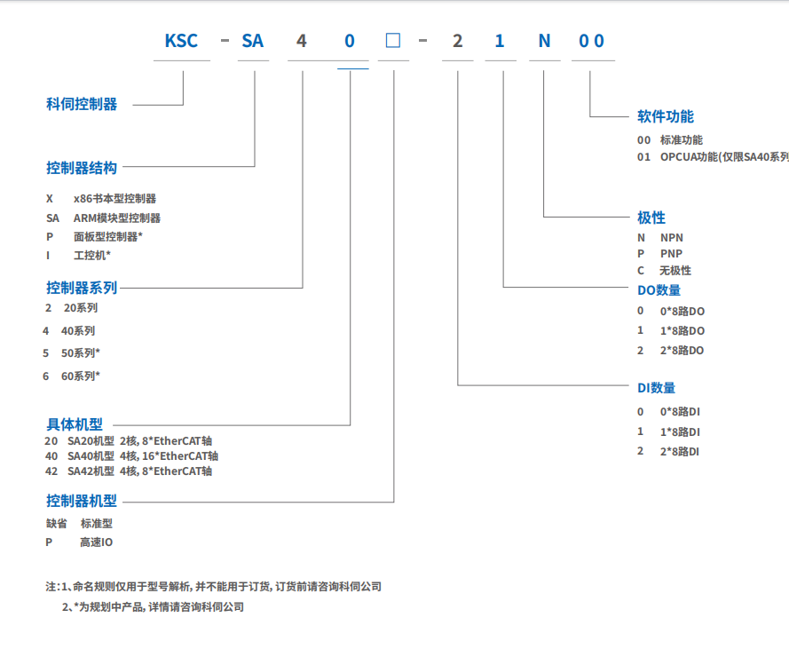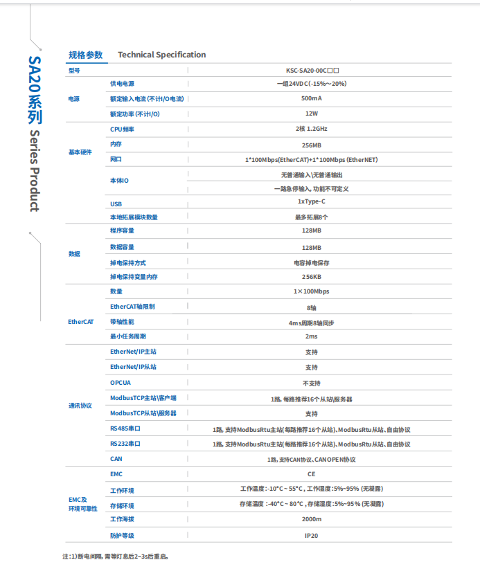 KSC-SA20 控制器符合 IEC61131-3 编程规范,支持 PLCopen 标准的 6 种编程语言。内部集成了 USB、RS485、 以太网、CAN 等常用工业控制接口。KSC-SA20 控制器支持 EtherCAT、MODBUS-TCP、CANopen、EtherNet/IP、 RS485 等进行远程机架扩展。